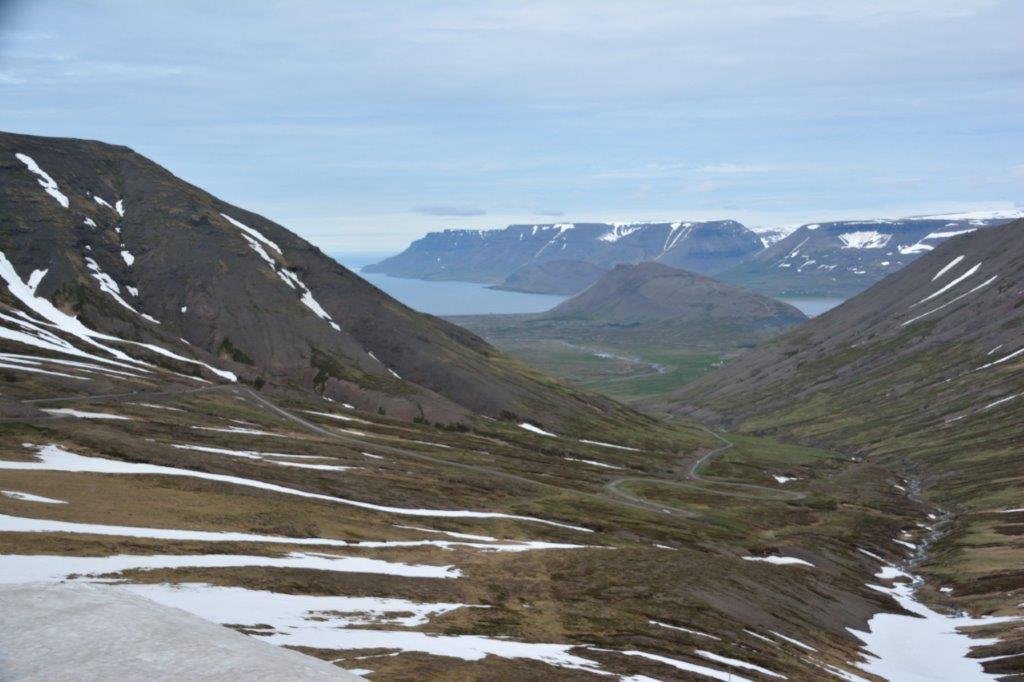 Logisch, nunmehr ging es bergab. Aber nicht lange, denn wir legten einen Fotostopp ein. Wahnsinn! Direkt unter uns der Berghang und das Tal mit der sich nach unten windenden Straße. Begrenzt von den Ausläufern des tief blauen Önundarfjörður. Und direkt dahinter die steil aufsteigenden Berge.