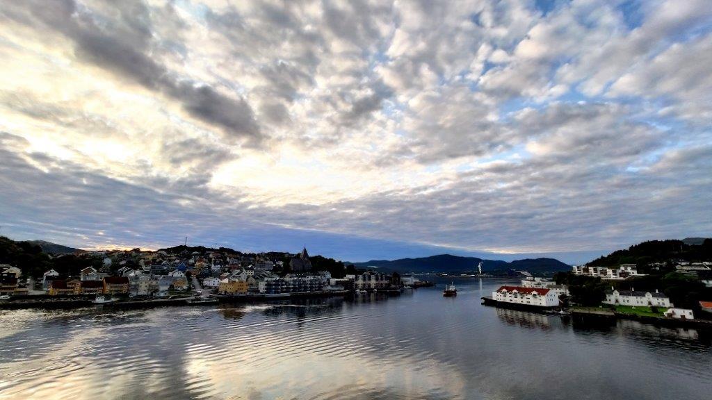 Am Himmel eine interessante Wolkenformation, die nur Gutes versprach. Auf Deck war es mit 10° frisch. Aber kein Problem – alle, die die Einfahrt beobachteten, waren dick eingepackt. Rund um den Hafen war alles bebaut. Keine alten Bauten; die Wehrmacht hatte bei ihrem Rückzug aus Norwegen leider fast alles in der Stadt zerstört. Die Städteplaner schufen in den letzten Jahren eine von der bisherigen Optik her ansprechende Stadt – Neubauten, weiße Wohnhäuser, aufgelockert durch farbige Gebäude. Zwischendurch sehr viel Grün.