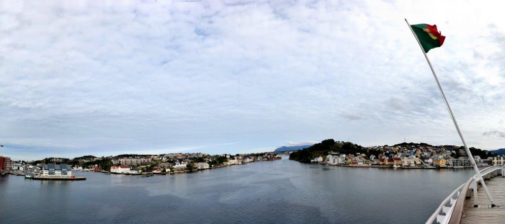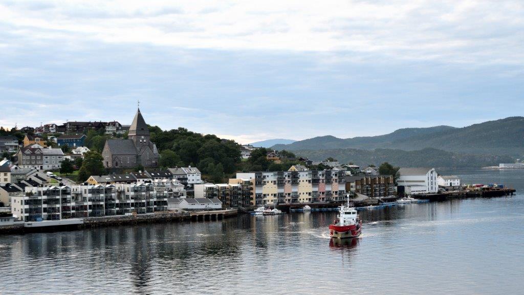 Vollkommen unspektakulär. Aber immerhin wurde uns von einem Balkon zum Abschied mit einer norwegischen Flagge zugewunken. Unser Schiff schwenkte langsam in den Bremsnesfjord. Die Aussicht auf Fjord und Kristiansund hatte schon etwas.