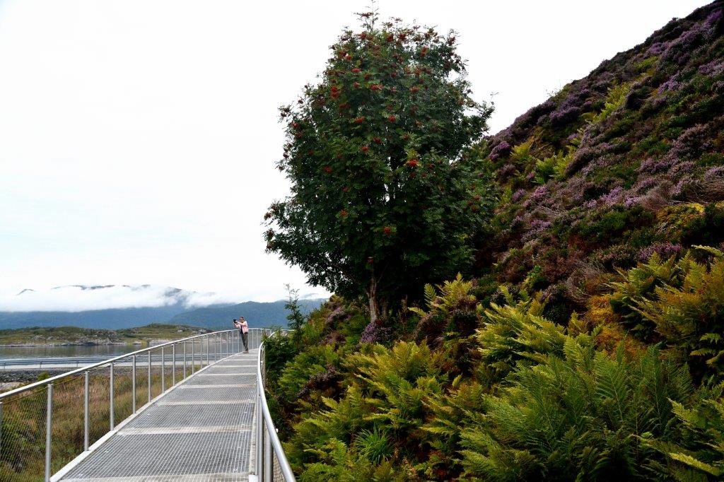 Weg von James und zurück zu unserem Ausflug. Unser Bus hielt auf dem größten Restplatz an der Atlantikstraße, Eldhusøya, mit einem in eine Anhöhe wunderbar integrierten Café. Um diese Anhöhe verlief ein Rundweg,