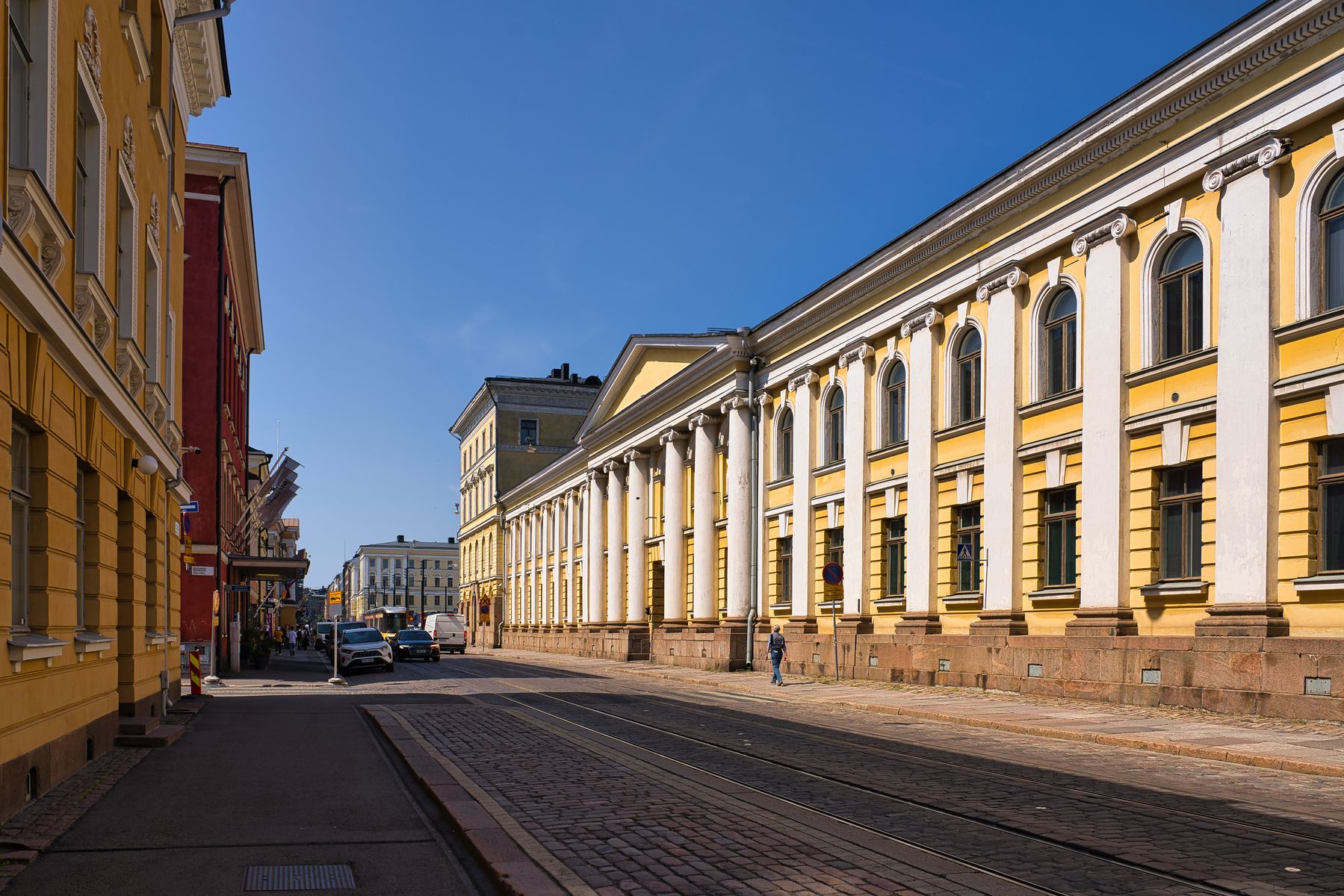 Nun wird aber Zeit, dass wir uns die Hauptsehenswürdigkeit Helsinkis näher ansehen. So gehen wir in Richtung Senatsplatz entlang der Seitenfassade des Regierungspalastes, wo sich das Büro des Premierministers oder auf finnisch „Valtioneuvoston kanslia“ befindet. Es ist das oberste Leitungsorgan der finnischen Regierung und geht auf den am 18.08.1809 per Dekret von Alexander I. von Russland gegründeten Senat, später Verwaltungsabteilung, des Großherzogtums Finnland zurück und wird heute vom Ministerpräsidenten und einem Staatssekretär geleitet.