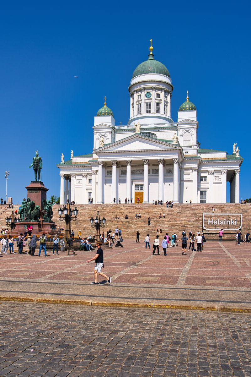 Dann erreichen wir den Senatsplatz mit dem alles überragenden weißen Dom von Helsinki oder auf finnisch „Helsingin tuomiokirkko“. Die von Carl Ludwig Engel entworfene evangelische Kirche gehört zum zwischen 1820 und 1850 erbauten klassizistischen Zentrum Helsinkis. Jährlich wird das Wahrzeichen der Stadt von 350.000 Menschen besucht.