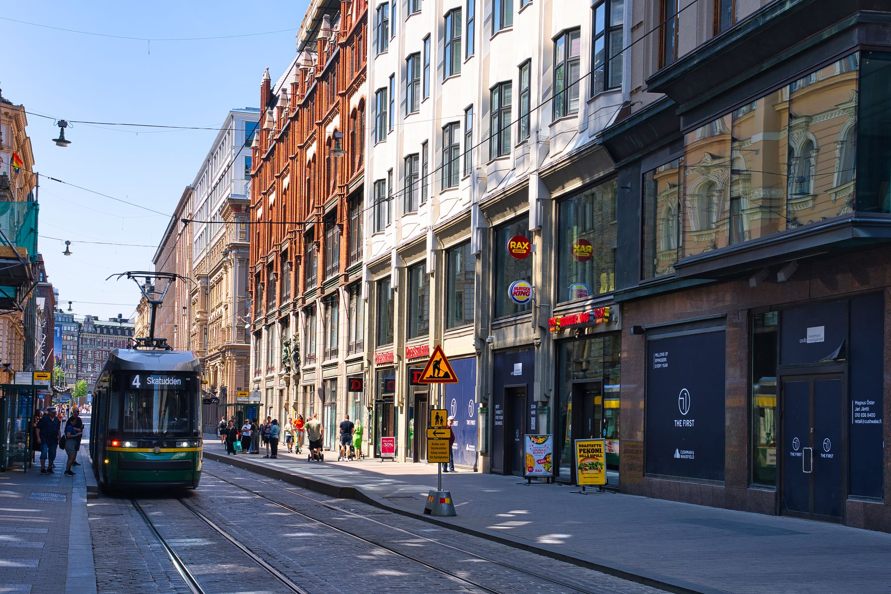 Die „Aleksanterinkatu“ oder auf schwedisch die „Alexandersgatan“ (wir erinnern uns, alle Straßennamen sind zweisprachig) ist die Einkaufsmeile Helsinkis und hat eine der schönsten Straßenbahnhaltestellen. Aber heute ist Sonntag ohne den alltäglichen Einkaufsrummel.
