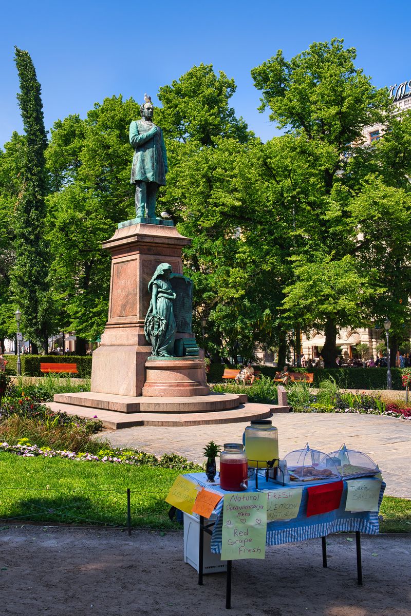 Die am 6. Mai 1885 im Esplanadi Park enthüllte Bronzestatue des Dichters Johan Ludvig Runeberg war das erste öffentliche Denkmal. Auf dem Sockel der acht Meter hohen Statue steht die Jungfrau von Finnland in ein Bärenfell gehüllt. In der linken Hand hält sie eine Tafel mit Strophen der finnischen Nationalhymne auf Schwedisch (Vårt land). Die Statue ist bei den Einheimischen nach wie vor beliebt und ein praktischer Ort, um sich zu treffen.