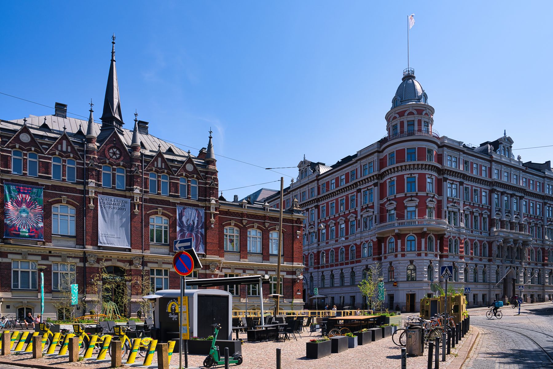 Um wieder zum Schiff zu kommen, müssen wir uns jetzt südlich orientieren. Dabei durchqueren wir das Stadtviertel „Ullanlinna“ und sehen das Design Museum (links) und das vier Sterne Aparthotel Bob W Koti (rechts) mit viel Jugendstil.