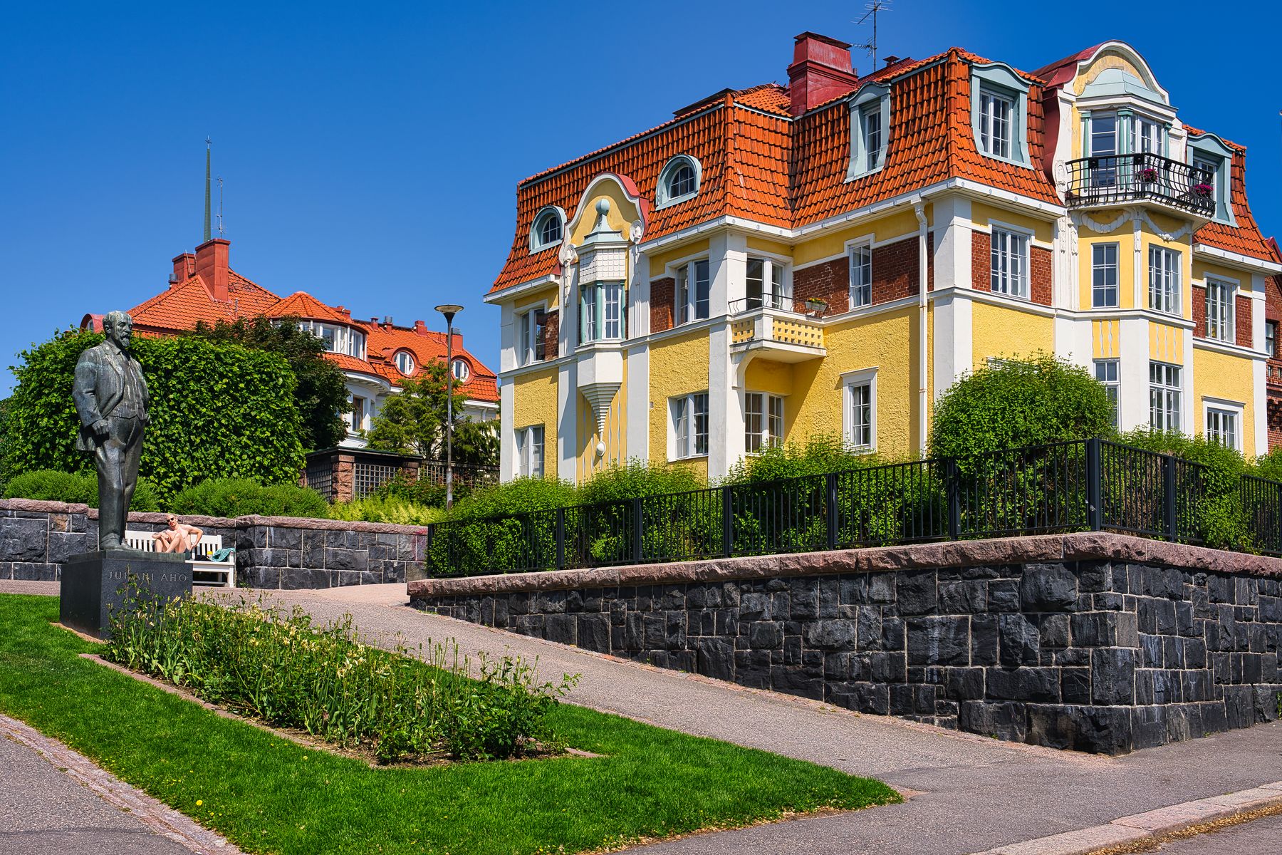 Im Mini-Stadtviertel „Eira“ stehen einige schöne Jugendstilvillen. Hier eine mit der Statue von Juhani Aho (1861-1921), einem finnischen Schriftsteller und Journalisten.