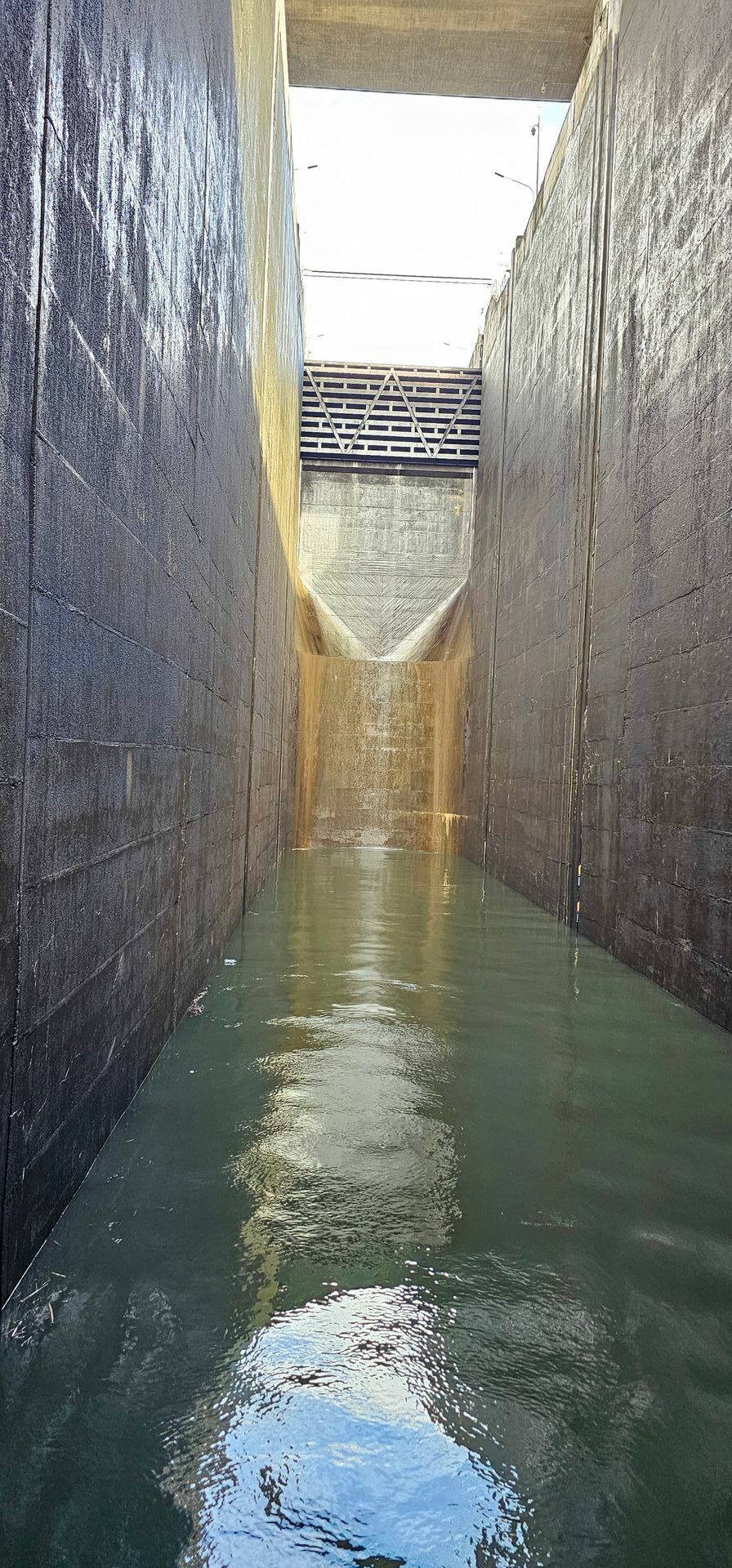 Die Eclusa da Carrapatelo ist mit 35 Metern Hubhöhe wohl das beindruckenste was ich je an Schleusen gesehen habe. In etwa 12 Minuten geht es in dem Schacht zu Berg und da sich direkt über dem Schiff eine kleine Brücke befindet, musste das Oberdeck gesperrt werden. Dies lag aber nicht nur an der Schleuse sondern auch an dem Umstand, dass der Douro durch die andauernden Regenfälle der letzten Wochen etwa 4 Meter Wasserhöhe mehr hat als sonst zu dieser Jahreszeit.