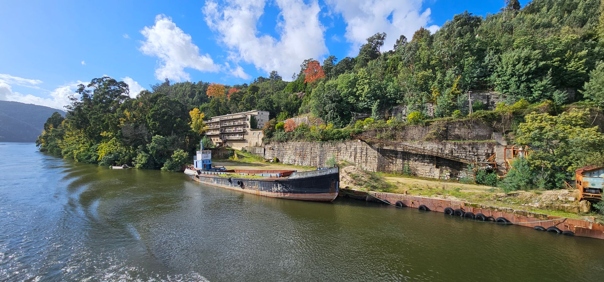Es ging um ein paar Flussbiegungen und schon waren wir, ca. 1 Stunde nach Ablegen an der Schleuse Eclusa de Crestuma-Lever mit einer Hubhöhe von 14 Metern. Da die Schleusenkammern zudem auch nur rund 90 Meter lang sind, ist es mit der Alva und ihrer Länge von 79,80 Metern schon recht knapp.
