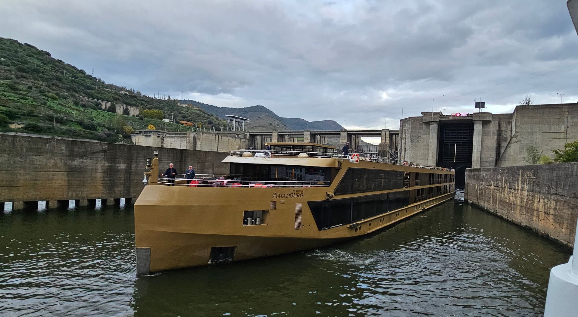 Die Eclusa da Carrapatelo ist mit 35 Metern Hubhöhe wohl das beindruckenste was ich je an Schleusen gesehen habe. In etwa 12 Minuten geht es in dem Schacht zu Berg und da sich direkt über dem Schiff eine kleine Brücke befindet, musste das Oberdeck gesperrt werden. Dies lag aber nicht nur an der Schleuse sondern auch an dem Umstand, dass der Douro durch die andauernden Regenfälle der letzten Wochen etwa 4 Meter Wasserhöhe mehr hat als sonst zu dieser Jahreszeit.