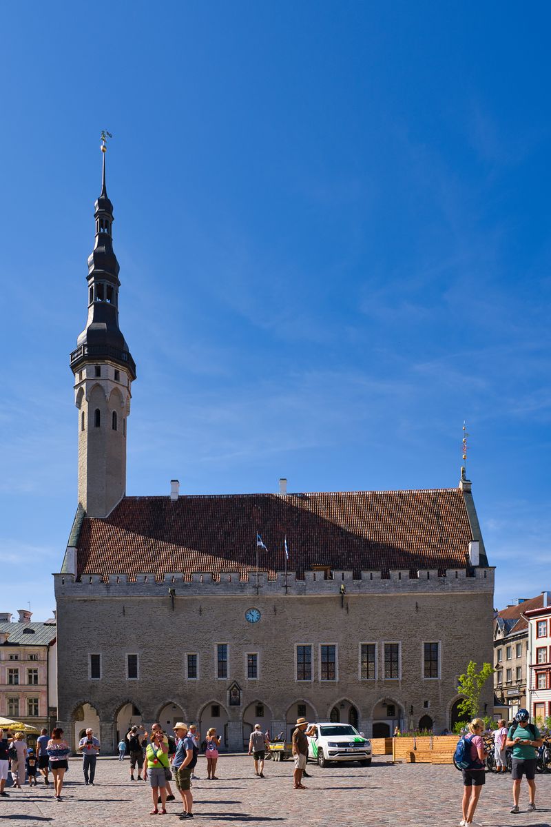 Das Tallinner Rathaus oder „Tallinna raekoda“ an der heutigen Stelle und in seiner jetzigen Form entstand zwischen 1402 und 1404. Es ist das einzige erhaltene Rathaus im gotischen Stil in Nordeuropa. An der Ostseite befindet sich ein schlanker, achteckiger Turm. Auf der Turmspitze befindet sich seit 1530 die berühmteste Wetterfahne Tallinns, der „Der alte Thomas“. Im 64 m hohen Turm ist eine der ältesten Glocken des Baltikums aufgehängt, die früher als Brandalarm diente.