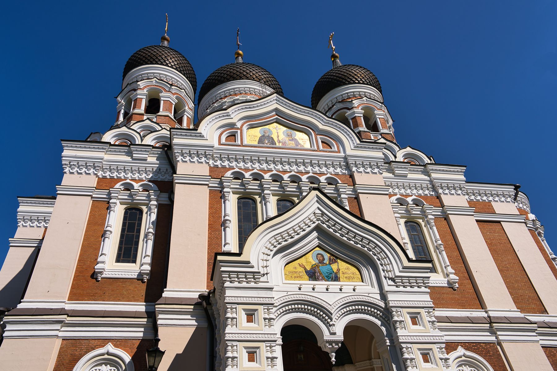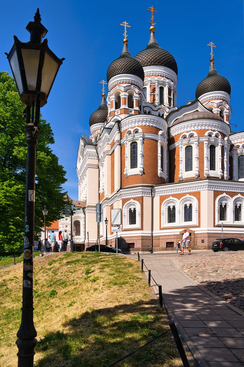 Dann sehen wir die Alexander-Newski-Kathedrale, die zwischen 1895 und 1900 als russisch-orthodoxe Kathedrale erbaut wurde. Während der Unabhängigkeit Estlands sollte die Kathedrale als Symbol der Russiefizierung im Jahre 1924 abgerissen werden. Der Sockel des Gebäudes besteht aus finnischem Granit. Auf den fünf Zwiebeltürmen sind vergoldete Eisenkreuze zu sehen.