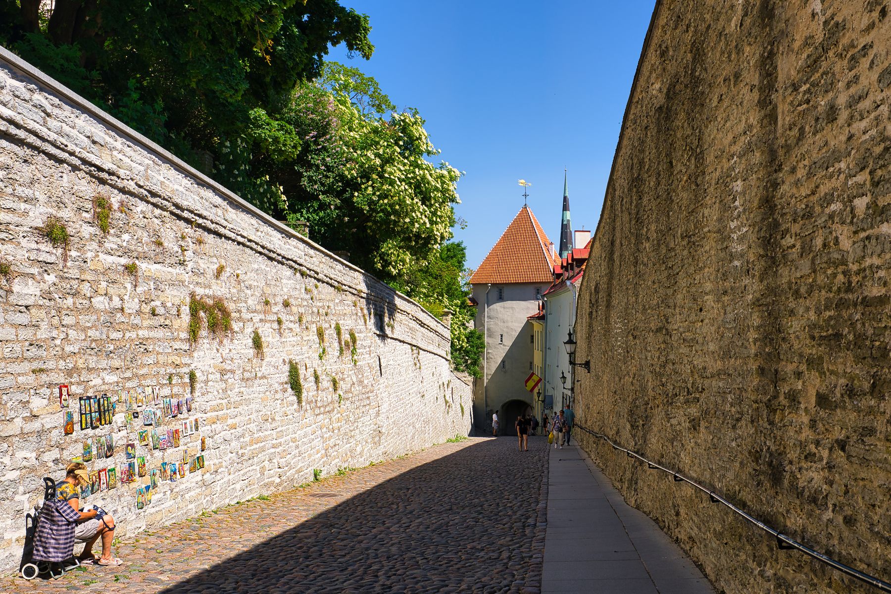 Unser Abstieg führt uns über den „Pikk jalg“ (Langer Domberg), dem einzigen gepflasterten Weg von der Revaler Unterstadt auf den Domberg. Entlang der Straße wurde in den Jahren 1454 und 1455 eine Mauer sowie zwei Tortürme errichtet. Abends wurden die Stadttore beider Städte auch jeweils geschlossen. Die enge Straße machte ein Passieren von Fuhrwerken unmöglich und man benötigte schon im 18. Jahrhundert eine Verkehrsregelung durch die unteren und oberen Wachen.