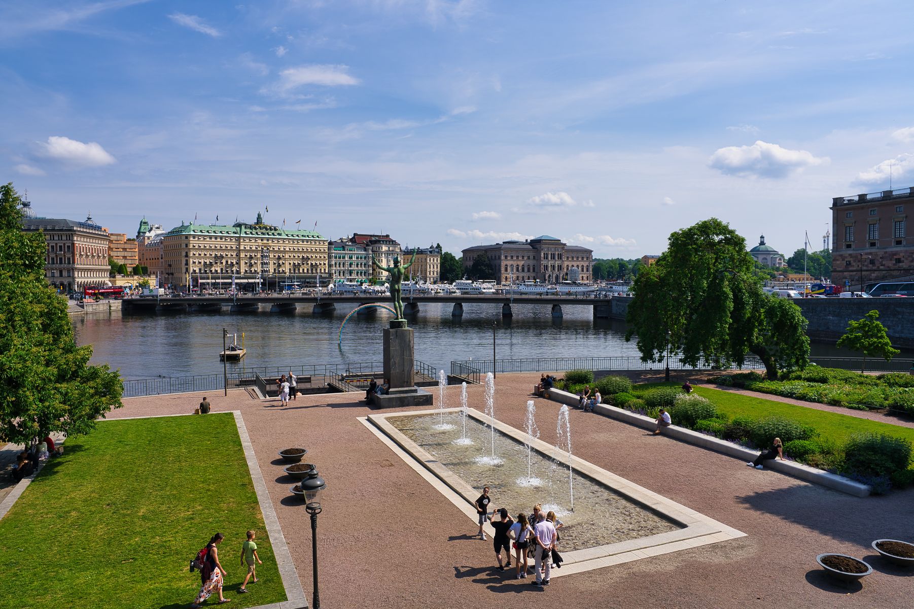 Nachdem wir das Schiff verlassen haben, über- und durchqueren wir den Nyroplan mit viel Verkehr und den ruhigeren Berzelii Park. Unser erstes Ziel ist das Schloss und Gamla Stan. Daher nutzen wir die „Norrbro“, von der wir einen schönen Blick auf einen kleinen Park haben. Die Skulptur von Carl Milles heißt „Solsångaren“, der Sonnensänger. Hinter der Strömbro sehen wir links das imposante Grand Hotel und rechts das mächtige Nationalmuseum.