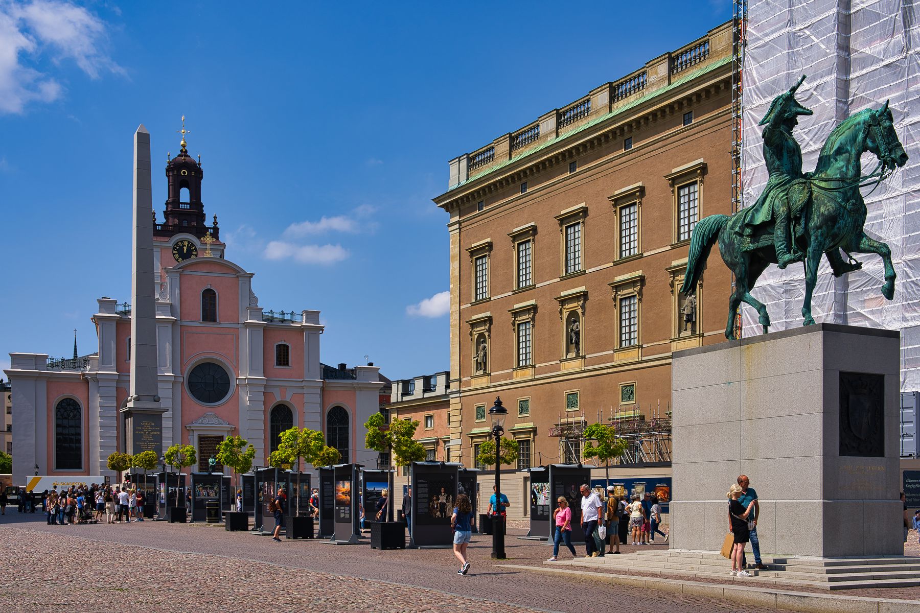 Das Schloss ist heute nicht sehr fotogen. Entweder liegt die Fassade im Schatten oder sie ist eingerüstet. Daher nur ein Bild vom seitlichen Slottsbakken mit der Ritterstatue von Carl XIV. Johan, dem Obelisken von Gustav III. und dem im Stile der Backsteingotik gebauten Dom von Stockholm, die Nikolai Kirche oder auch die Große Kirche. In der „Storkyrkan“ hat im Juni 2010 die Kronprinzessin geheiratet.