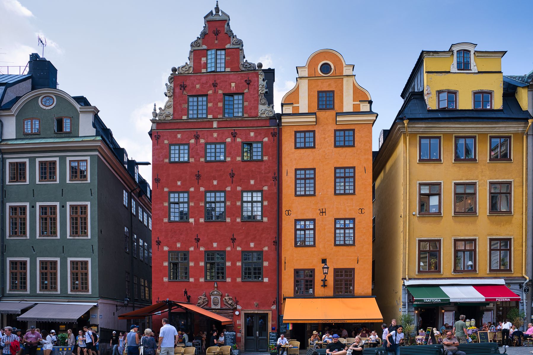Besonders schön ist die Westseite des Stortorget. Hier stehen die farbigen Häuser.Das grüne Gebäude links ist das Runstenshus. Daneben befindet sich in rotbraun das Schantzka hus von 1605. Das orangene Gebäude ist das Seyfritzka hus aus dem Jahr 1520. In dem gelben Haus rechts, dem Scharenbergska Stortorgshus, befand sich die erste Apotheke Schwedens.