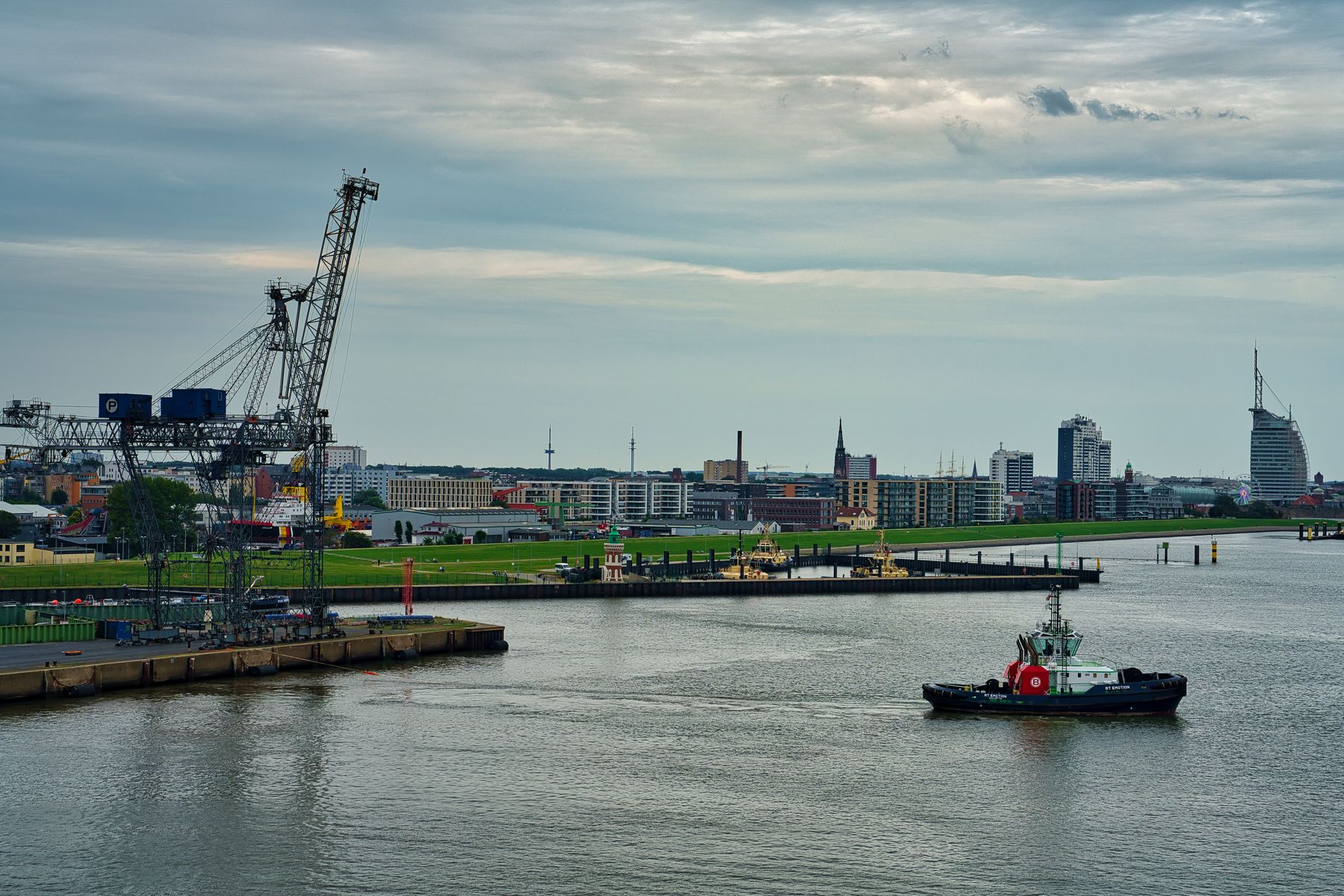 Ein Stück Weser abwärts legt ein Containerschiff der Reederei Maersk von der Columbuskaje ab und dreht mit Schlepperhilfe in Richtung Nordsee.
