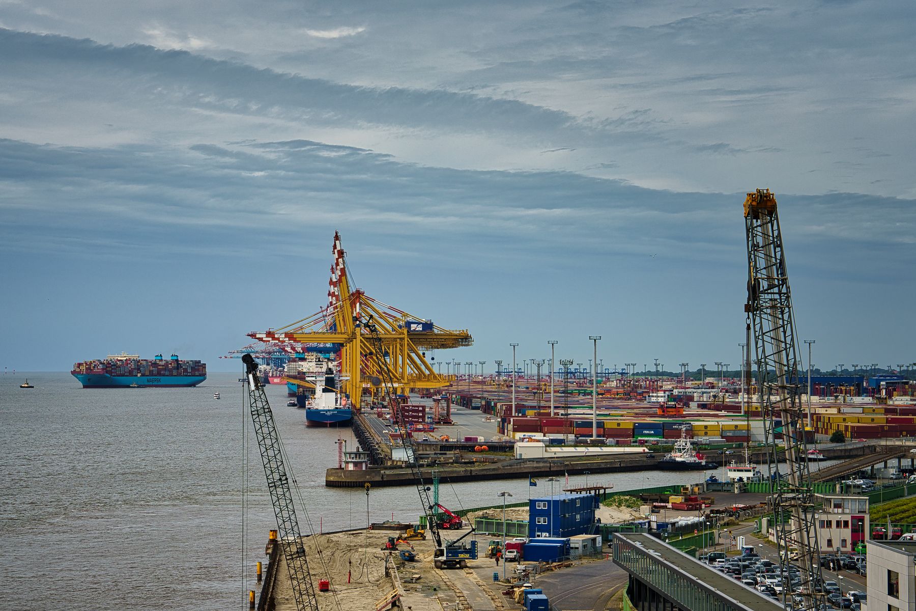 Ein Stück Weser abwärts legt ein Containerschiff der Reederei Maersk von der Columbuskaje ab und dreht mit Schlepperhilfe in Richtung Nordsee.