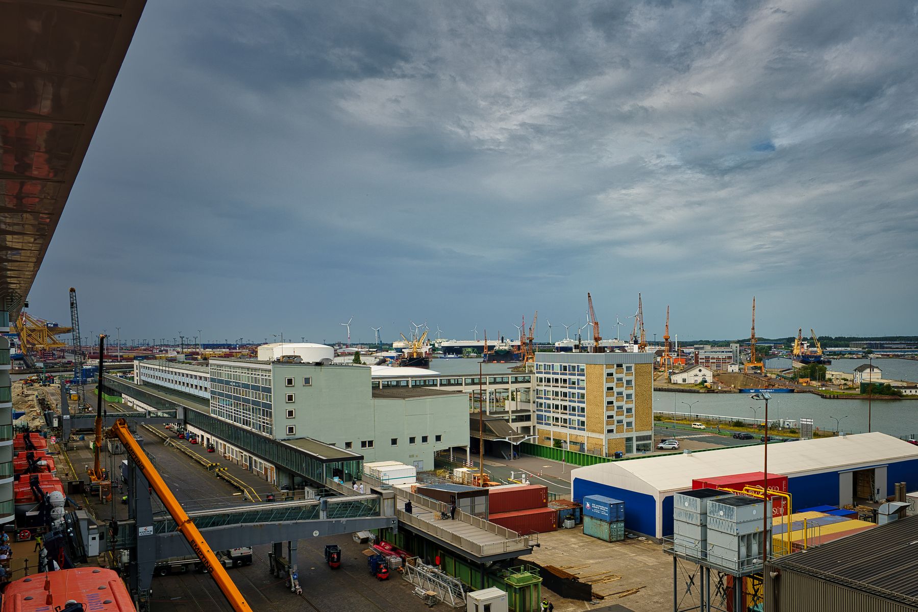 Kurz nach vier begeben wir auf unsere Kabine. Die Reisetaschen sind angekommen und ihr Inhalt verschwindet in den Schränken. Noch schnell ein Foto vom Balkon. Der Terminal ist nicht schöner geworden.