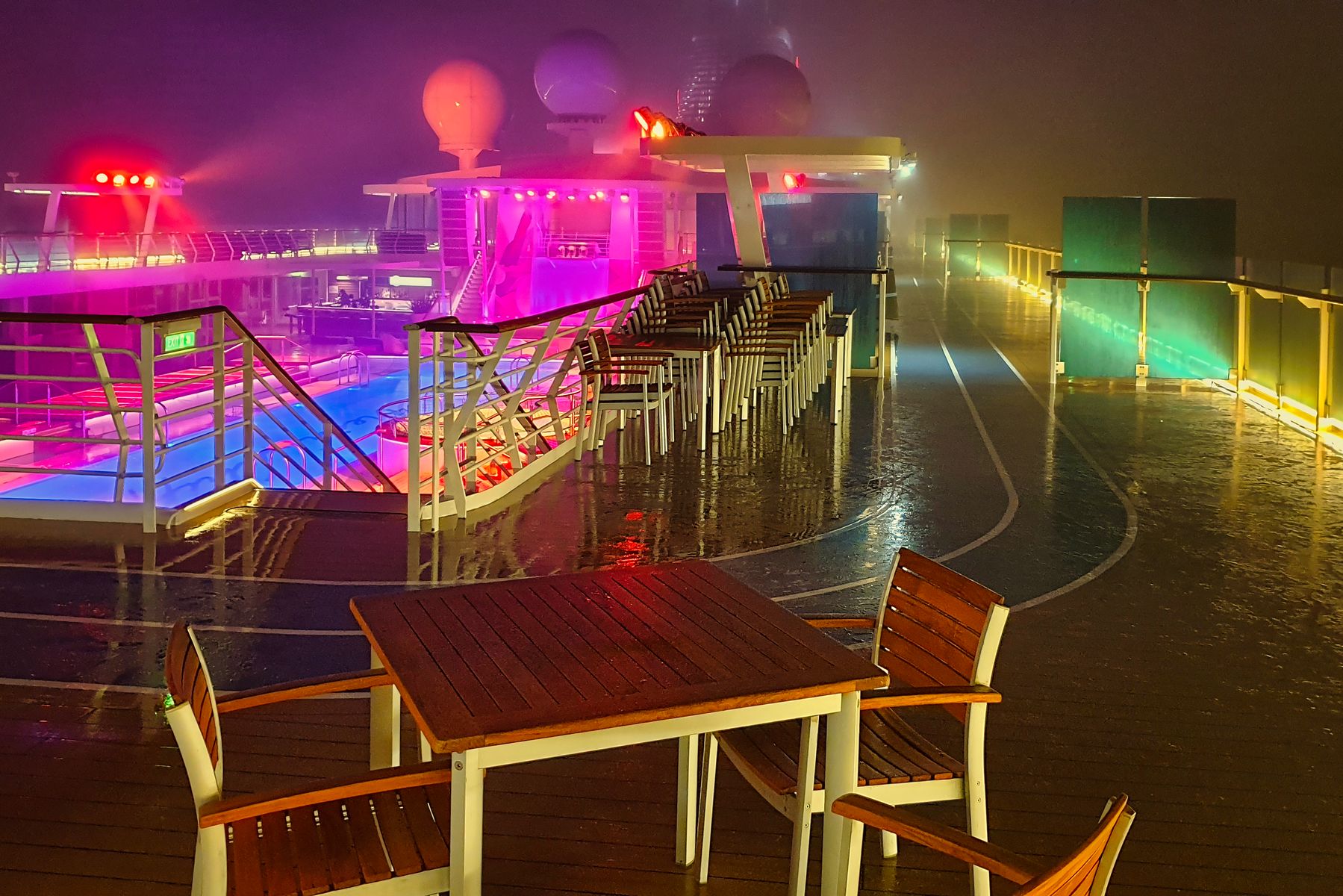 03.08.2022. Acht Uhr. Mittwoch Morgen. Wir haben super geschlafen. Früher fanden wir Seetage nicht so prickelnd. Wir konnten nichts an Land unternehmen. Heutzutage lieben wir Seetage. In Ruhe frühstücken. Einige Runden um den Schornstein drehen. Auf einen Latte Macchiato und eine heiße Schokolade in der Außenalster Bar einkehren. Noch einige wenige Schritte und dann können wir auch für ein paar Sushi Rollen oder Tapas in die X-Lounge. Und ein oder zwei Gin Tonic für eine angenehme Bettschwere in der anschließenden Siesta. Ich sitze nachmittags zum Lesen gern auf unserem Balkon. Kurz nach drei überholt uns ein Containerriese mit zweifelhaftem Ruf, die „Ever Given“.