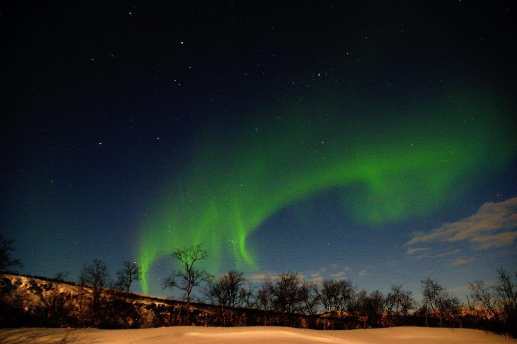 Uns wurde es in der Hütte zu warm. Also rein in die dicken Jacken und raus in die Kälte. Eigentlich schade, denn wir mussten auf Erlebnisse mit Mutter und Tochter verzichten. Ehemann und gleichzeitig Vater benötigte auch eine Pause von den beiden. Er folgte uns. Wir stellten die Stative in Positur und richteten die Kameras ein. Wo blieben nur die Nordlichter? Woanders? Warum nicht bei uns? Na ja, Alta in der Ferne sah auch nicht schlecht aus. Wie auch das Samizelt und die Eismauer mit Illumination. Aber trotzdem? Wo laufen sie denn? Mein Gott, bei mir ist alles dunkel, aber was ist denn das? Die Nordlichter! Meine ersten Nordlichter! Zunächst zögerlich, aber noch nicht so, wie wir es gerne gehabt hätten.