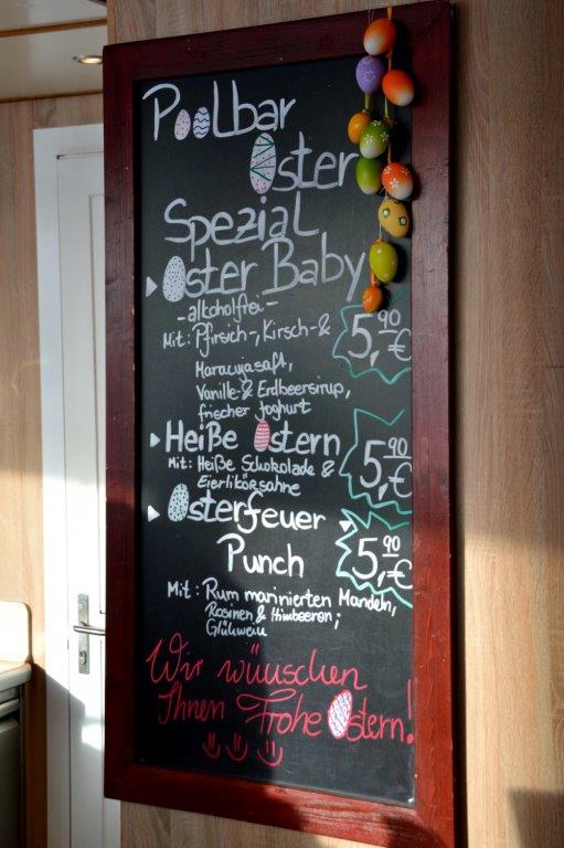 Noch ein Blick heckwärts bevor wir uns zum Frühstück begab. Na, die Kulisse und das Wetter versprach alles! Auf dem Weg in die Schiffsinnereien bekamen wir mit, dass man sich auf das Osterfest vorbereitet hatte.
