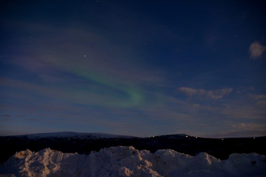 Uns wurde es in der Hütte zu warm. Also rein in die dicken Jacken und raus in die Kälte. Eigentlich schade, denn wir mussten auf Erlebnisse mit Mutter und Tochter verzichten. Ehemann und gleichzeitig Vater benötigte auch eine Pause von den beiden. Er folgte uns. Wir stellten die Stative in Positur und richteten die Kameras ein. Wo blieben nur die Nordlichter? Woanders? Warum nicht bei uns? Na ja, Alta in der Ferne sah auch nicht schlecht aus. Wie auch das Samizelt und die Eismauer mit Illumination. Aber trotzdem? Wo laufen sie denn? Mein Gott, bei mir ist alles dunkel, aber was ist denn das? Die Nordlichter! Meine ersten Nordlichter! Zunächst zögerlich, aber noch nicht so, wie wir es gerne gehabt hätten.