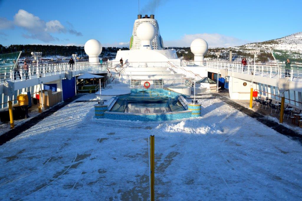 Nun aber zurück zur morgendlichen Bordinspektion. Wer baute sich vor uns auf? Eine Schneefamilie! Ein bisschen mickrig, aber ein Zeichen des Winters. Nun aber abseits des Schiffs. So richtig viel Interessantes war rund um den Hafen nicht zu erkennen. Modernere Gebäude; Zweckbauten. Der Flugplatz, der von Kapitän Müller anvisiert wurde (!). Dann wieder zurück auf unsere AIDAcara: ein Mitglied der Crew, das Tanzschritte übte. Oberhalb des Häusergewimmels (?!) eine Sprungschanze, die uns das Hinterteil zeigte. Das war auch in Ordnung – sollten die Sportler auf unserer AIDAcara landen?