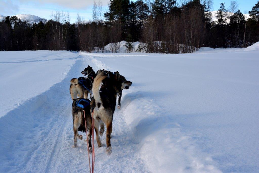 Ein Schlitten nach dem anderen startete – dann waren wir an der Reihe. Und los ging´s! Ein Ruck und unsere Hunde peesten los. Wir hätten nicht gedacht, dass acht Hunde aus dem Stand heraus ein derartiges Tempo erreichen konnten. Nun gut, für sie war Bewegung nicht nur Arbeit sondern ein notwendiges Vergnügen. Auch deshalb waren sie froh, den Ketten vor ihren Hütten entrinnen und ein strammes Tempo einschlagen zu können. Nach dem Verlassen der Lodge fuhren wir zunächst über eine freie Fläche – natürlich auf vorgespurten bzw. gewalzten Pfaden. Anschließend wurden wir durch einen Wald gezogen.