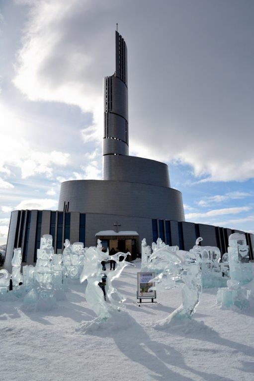 Wir passierten die Altakirke, den daneben liegenden Friedhof, auf dem nur die oberen Teile der Grabsteine zu sehen waren, die Nordlichtkathedrale und kamen wieder bei unserer AIDAcara an. Den nach der vielen frischen Luft entstandenen Hunger stillten wir und ließen uns anschließend per Shuttle in die Stadt bringen. Es war nicht mehr weit bis zur Hauptattraktion Altas, der Nordlichtkathedrale, aber glatt. Nicht nur auf der Straße – auch auf den Bürgersteigen. Aber das war für uns kaum ein Problem. Wir standen schließlich vor der Nordlichtkathedrale. Die Kathedrale wurde im Jahre 2013 eingeweiht. Ihr Äußeres erinnerte stark an die Schwingungen des Nordlichtes. Sie wurde gänzlich aus Beton gebaut und mit Titanplatten verkleidet. Vor dem Sakralbau waren glücklicherweise die dort im Winter üblichen Eisskulpturen noch nicht geschmolzen. Einfach toll, welche leider vergängliche Figuren für die Allgemeinheit geschaffen wurden. Auf einem Schneehügel hatten die Eiskünstler eine ellenlange Schlange aus Eis geformt, die nach dem Schneefällen der vergangenen Tage durch Tiefschnee kroch.
