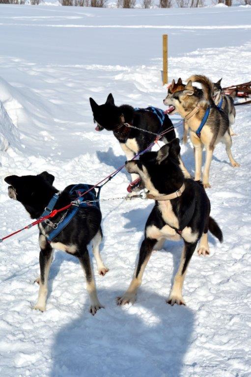 Auch wenn wir uns noch nicht in unmittelbarer Nähe der Hunde befanden, ahnten sie bei Ankunft des Busses, dass sie in Kürze ihrem Drang nachgehen durften – nicht dem Futter- sondern dem Bewegungsdrang. Wir kamen näher und sahen, dass sie sich mit lautem Gebell und Herumspringen auf die kommende Tour freuten. Sieben Schlitten waren vorbereitet: Die Huskies waren eingespannt und wurden von den Mushern in Schach gehalten. Die Hundeschlittenführer gaben keine lauten Anweisungen – sie blieben ruhig und gaben für die Hunde ruhige und eindeutige Befehle.