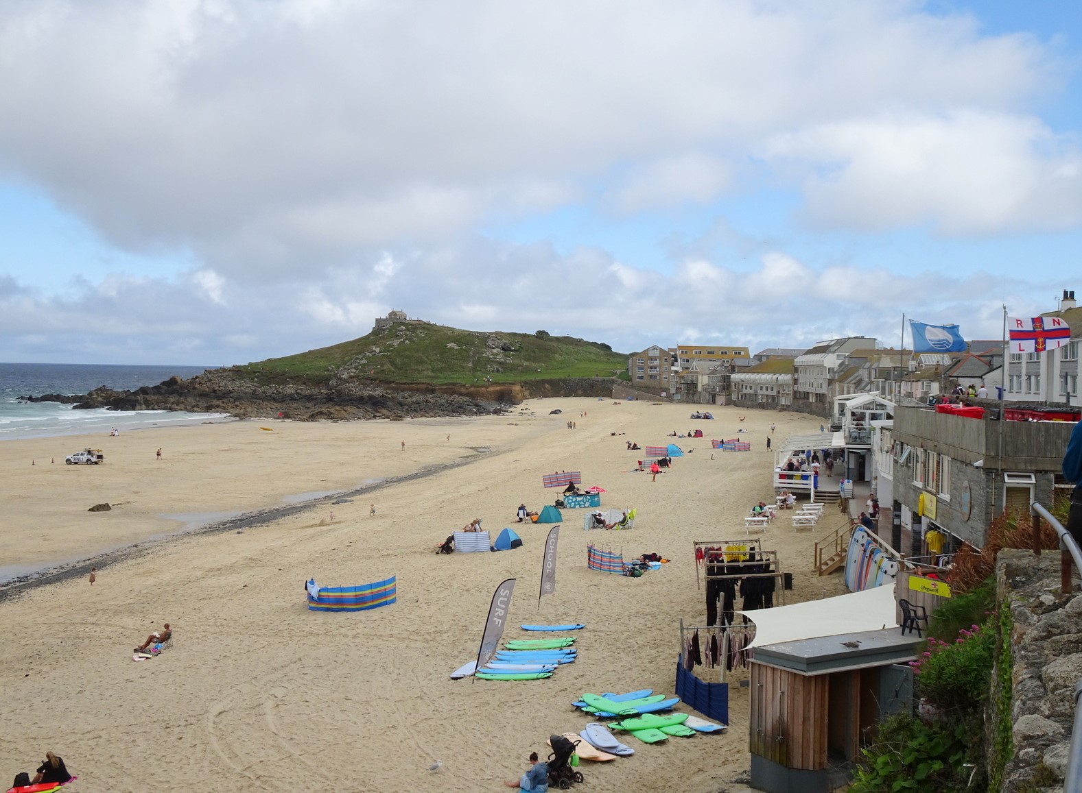 Hoch oben über dem ehemaligen Fischerörtchen St. Ives sind wir und fahren auf einen Parkplatz. Habe mich schon die ganze Zeit gewundert, dass die Reiseleiterin immer von einem „Shuttlebus“ spricht und dachte, dass es so eine sprachliche Sache ist, wegen Engländerin und so. Tatsächlich aber müssen wir jetzt umsteigen.