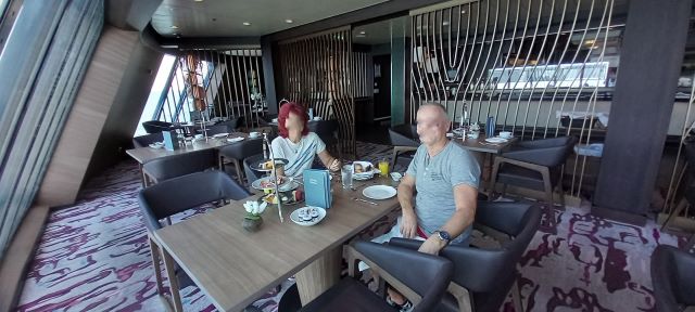 Gegen einen kleinen Aufpreis kann man ein serviertes Frühstück, bei schöner Aussicht, zum Heck hinaus, in Ruhe genießen. Danach gingen wir ins Theater um uns einen Vortrag über Indien anzuhören.