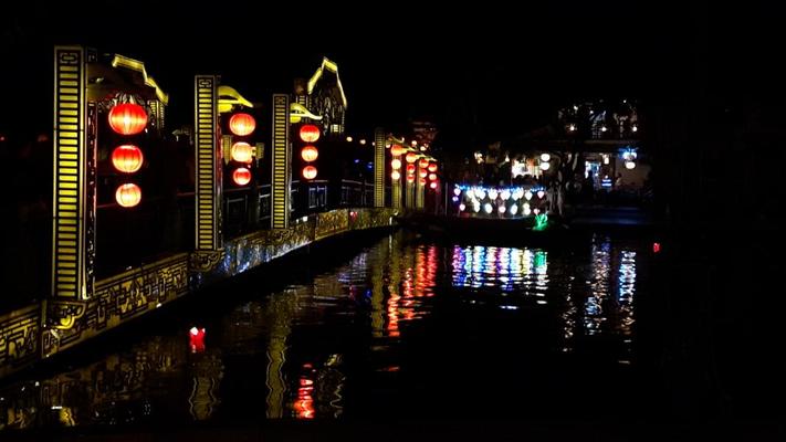 Boote mit bunten Lampions geschmückt fahren an uns vorüber und auf dem Wasser treiben Blüten aus Papier mit Teelichtern drin.