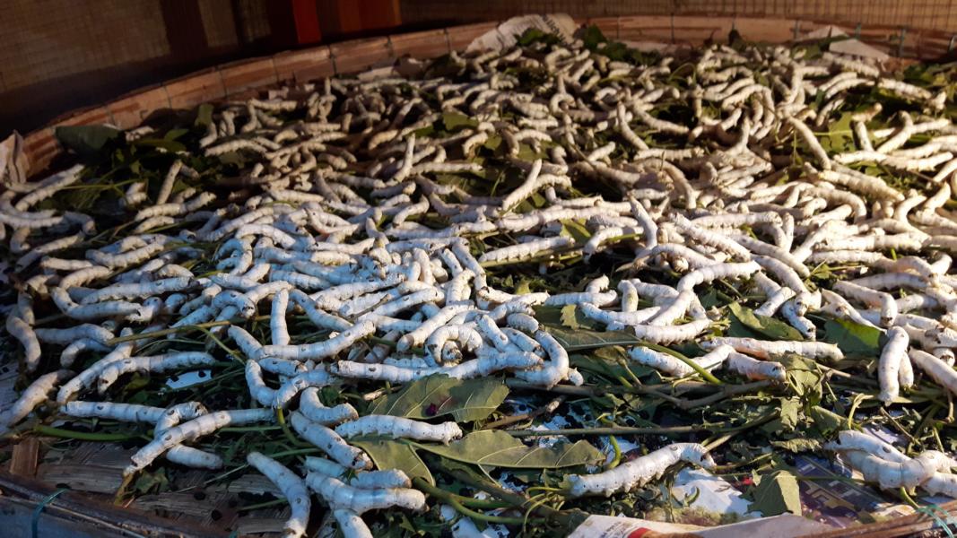 lebenden Seidenraupen. Deren Leibspeise sind die Blätter des Maulbeerbaumes.