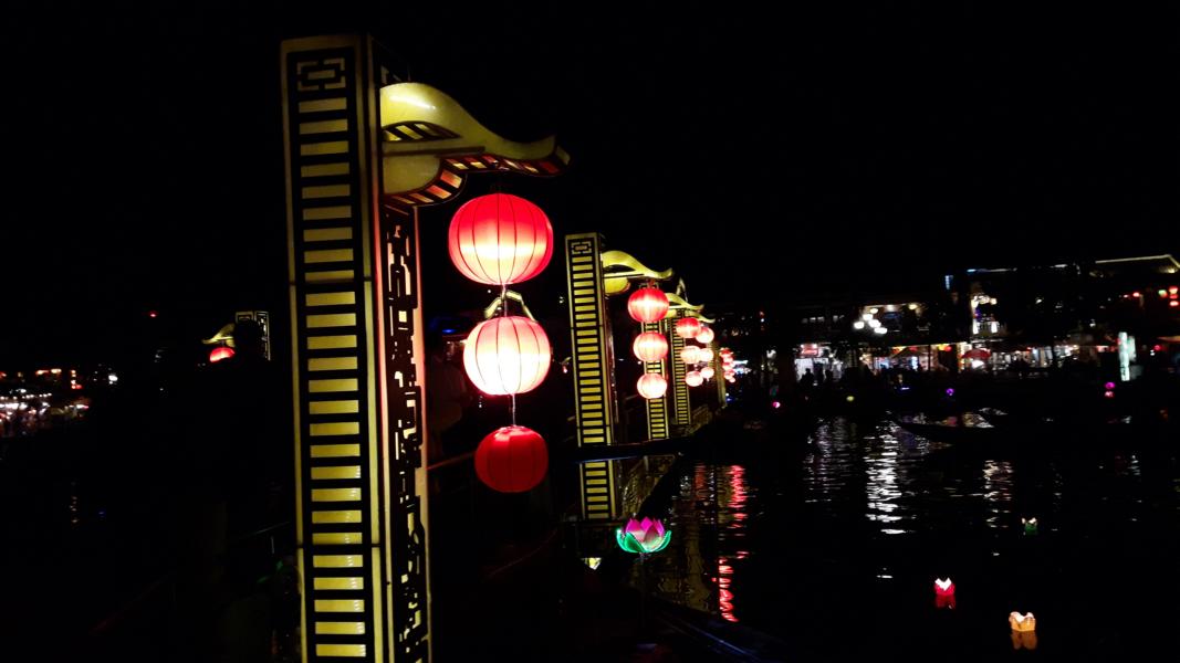 Boote mit bunten Lampions geschmückt fahren an uns vorüber und auf dem Wasser treiben Blüten aus Papier mit Teelichtern drin.