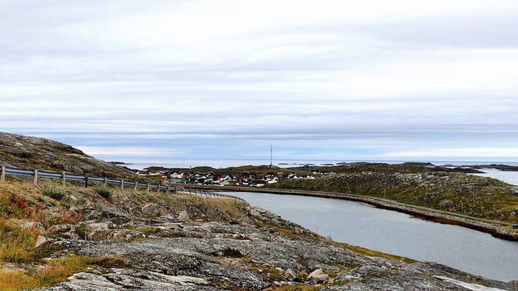 Von der Abzweigung der E69 ist Gjesvær ca. 20 km entfernt. 20 km durch eine Traumlandschaft. Eine Straße durch eine endlose Hochebene. Felsig, wieder ab und zu kleine Seen, Bäche und Mini-Wasserfälle. Zeitweise von den tief liegenden Wolken verdeckt. Bäume? Fehlanzeige! Sträucher? So gut wie gar nicht. Dafür weite, noch immer mit Flechten bewachsene Flächen. Blumen? Nach unserem Verständnis eher Wildkraut. Doch wenn sie auftauchten eine Augenweide – so ungewöhnlich in dieser kargen Landschaft. Wir verließen die Hochebene. Heraus aus den Wolken. Klare Sicht. Die ersten Häuser unseres Zwischenziels Gjesvær waren zu erkennen,
