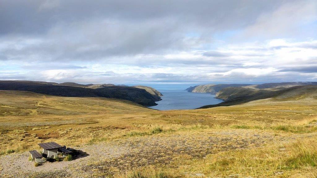 als neben der Straße viel Wasser auftauchte. Und noch besser: eine Parkmöglichkeit! Also raus aus unserem Hyundai und Blick nach vorne. Meer, Felsen, zu unseren Füßen ein von Hügeln umsäumter Ausläufer des Nordmeers.