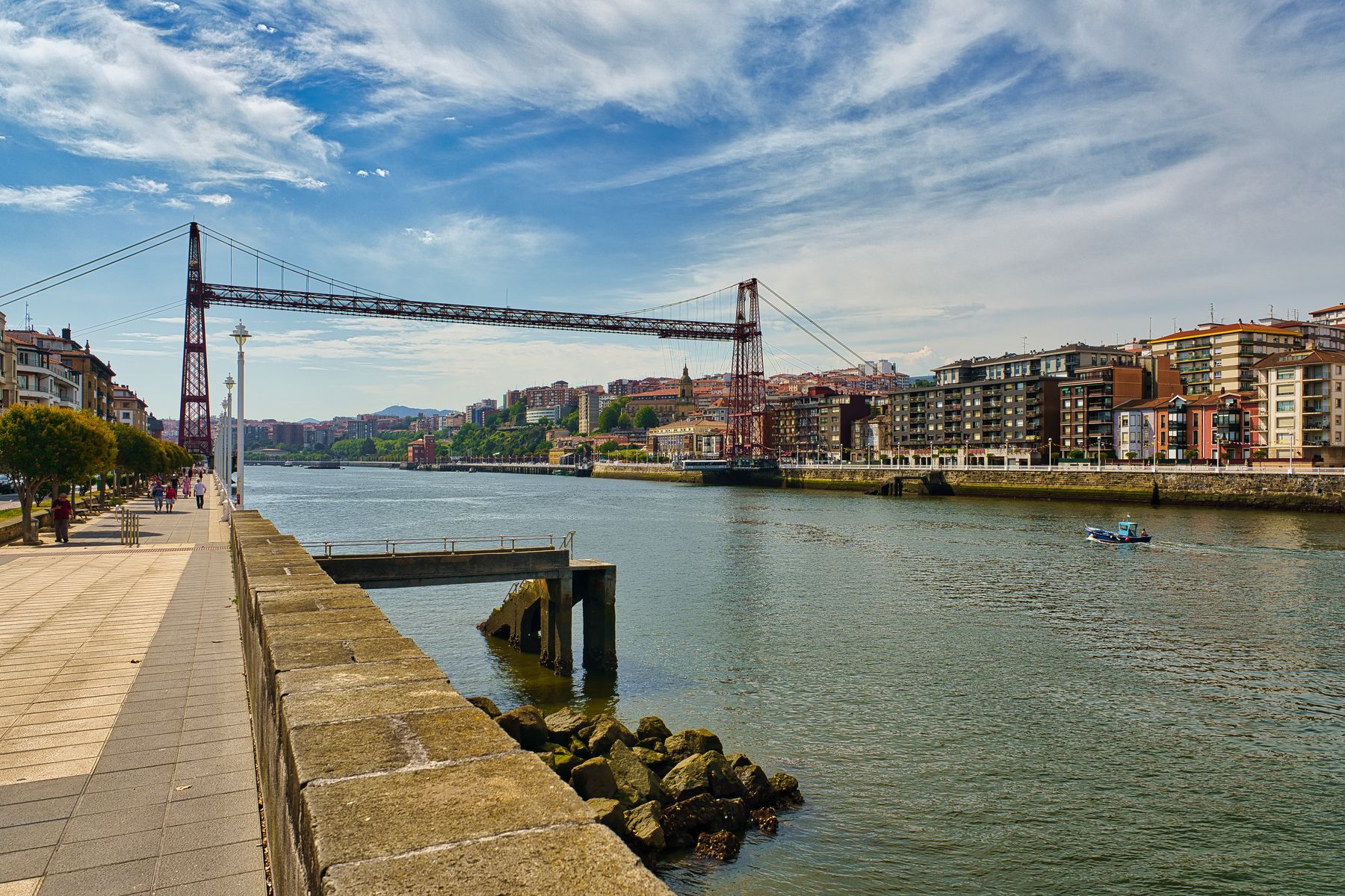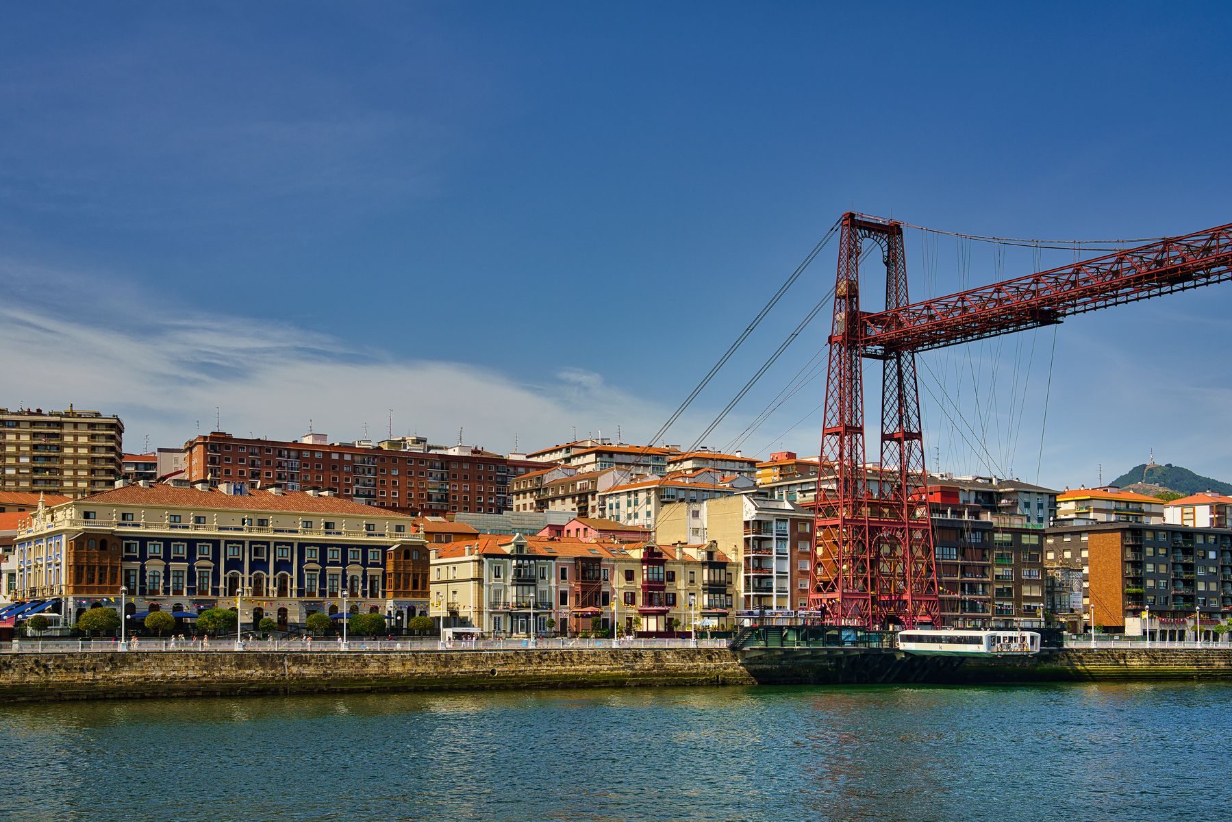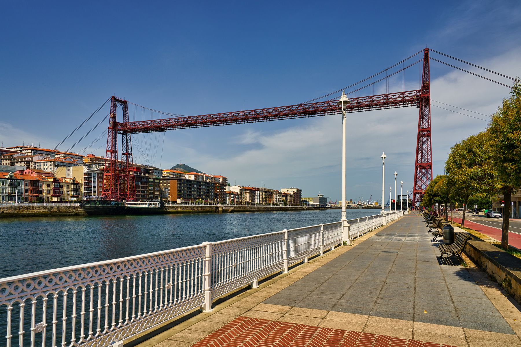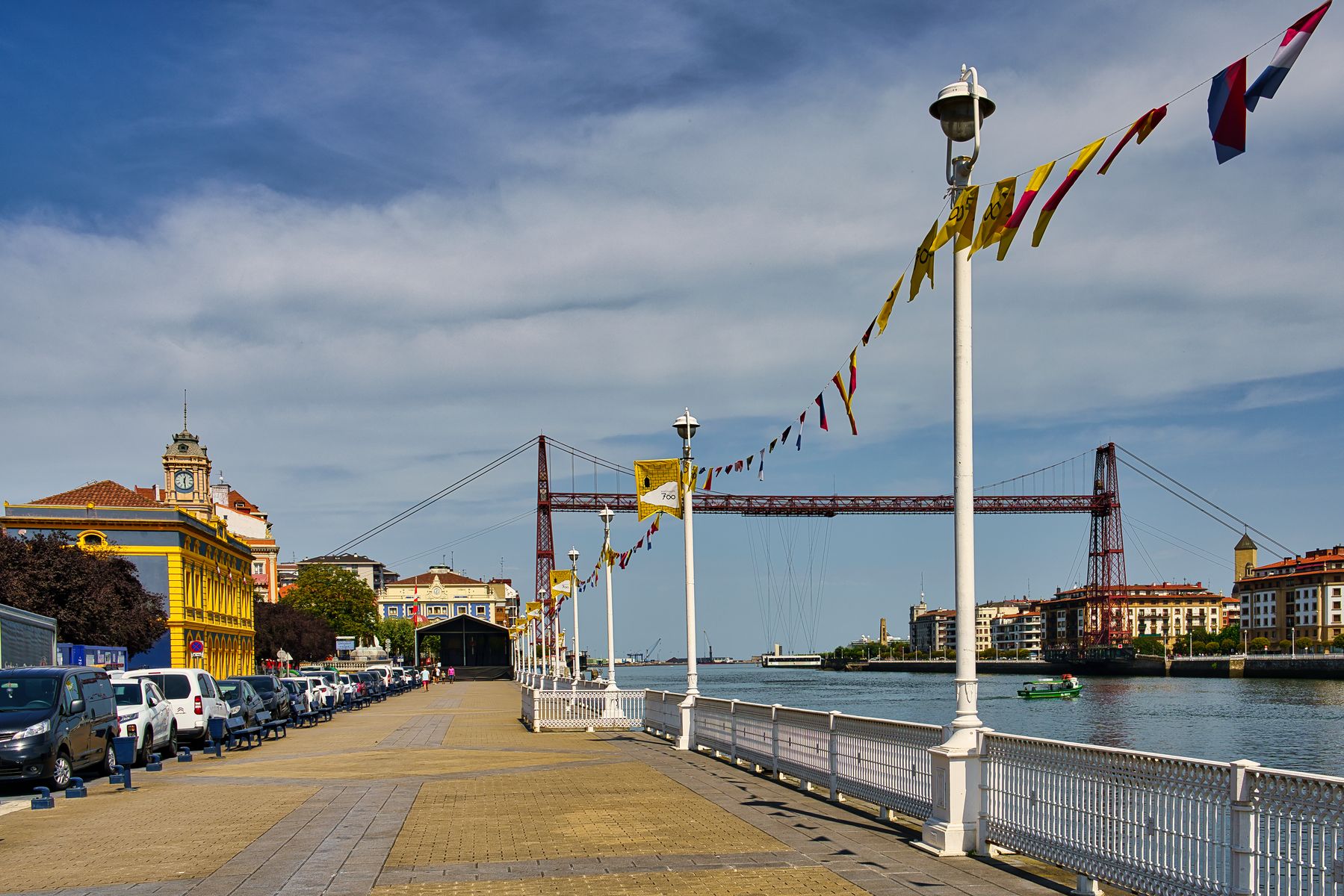 Im Stadtteil Areeta am Ende der Promenade erreichen wir den Nervión, den Fluss, am dem flussaufwärts Bilbao liegt. Wir biegen um die Ecke und sehen die älteste Schwebefähre der Welt, die Puente de Bizkaia aus dem Jahre 1893. Selbstverständlich zählt sie seit 2006 zum Weltkulturerbe der UNESCO.