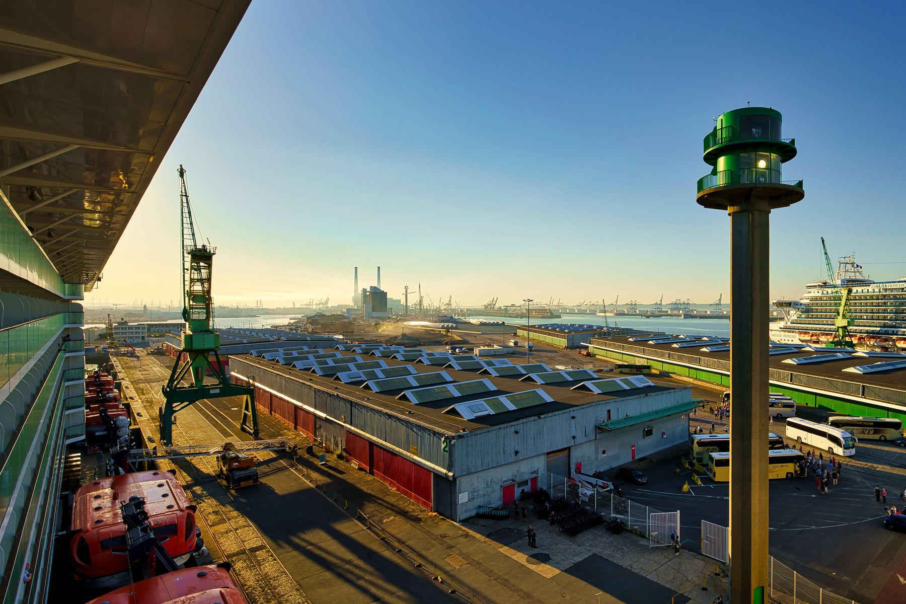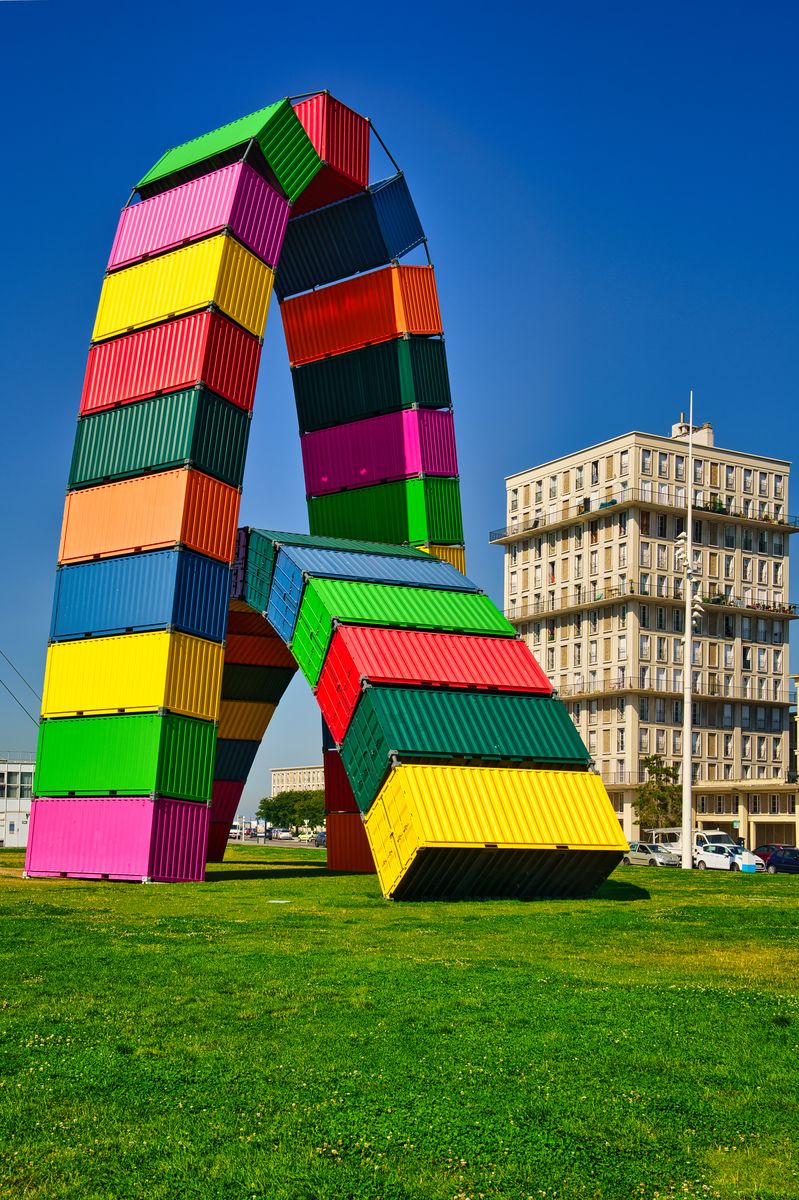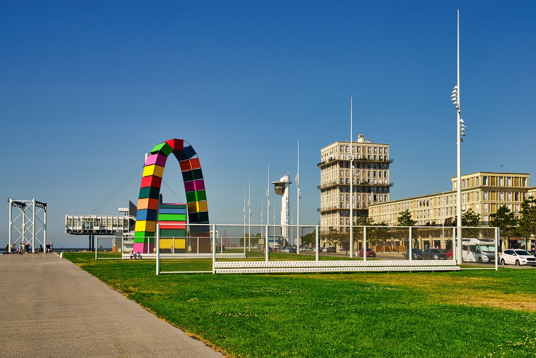 Vor dem Port Center steht der Containerbogen „Catène De Containers“.