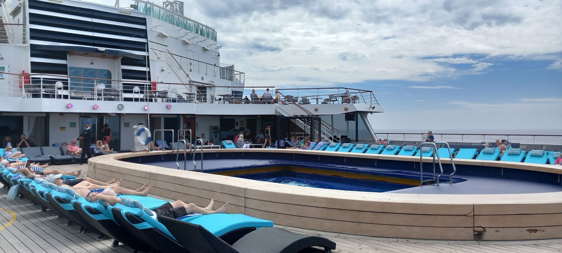 Heute war wieder einmal relaxen angesagt. Bis jetzt war es nie ein Problem eine Liege, auch im Schatten, zu bekommen. Das freut natürlich sehr. Der Pool ist nicht sonderlich warm, schätze so ca. 28°, man kann sich etwas abkühlen. Von der Größe und vor allem von der Tiefe 1-1,2m ist eher ein großes Planschbecken und weniger zum Schwimmen geeignet. Die Whirlpools sind relativ groß und auch gut geheizt mit ca. 34°. Auch die werden relativ wenig benützt. Da auf Deck doch sehr oft starker Wind weht, ist das überdachte Deck mit dem Innenpool echt super. selbst wenn das Verdeck aufgemacht wird, bekommt man von der Windstärke relativ wenig mit. Auch hier ist der Getränkeservice präsent, hin und wieder muss man auf sich mit einem Winken aufmerksam machen, und dann bekommt die Getränke auch an die Liege serviert. Vom Service sind wir bis jetzt rundherum begeistert.