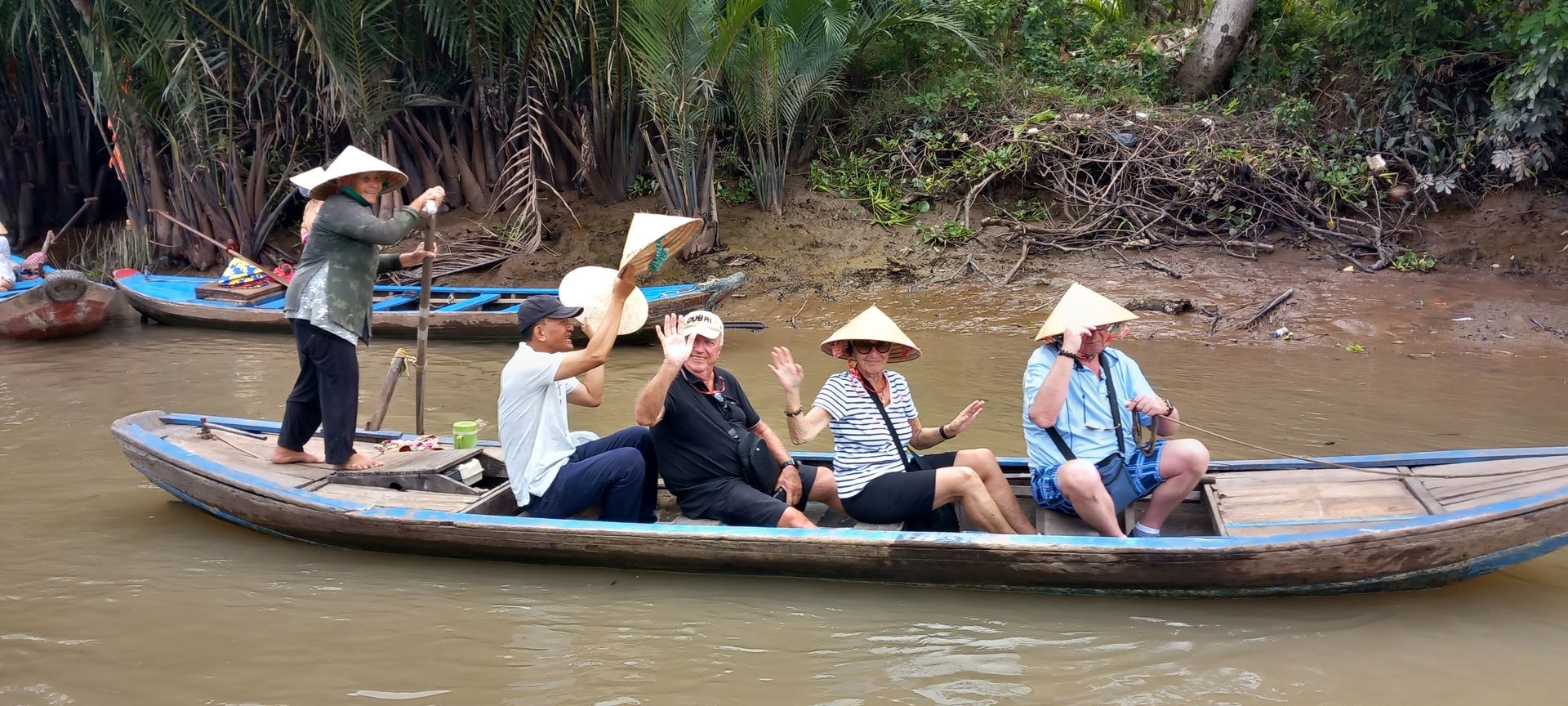 Heute steht ein Ausflug zum Mekong an. Eine 2 stündige Busfahrt, während der uns der deutschsprachige vietnamesischer Reiseleiter interessante Informationen erzählt, bringt uns zu einem Boot mit dem wir dann am Mekong etwas herumfuhren,