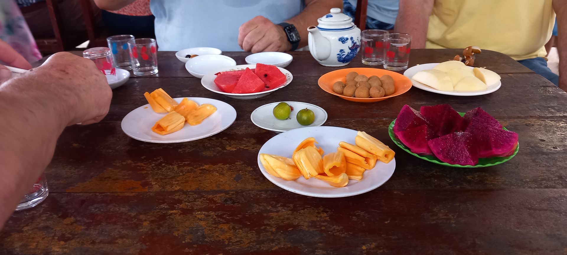 Als wir aussteigen erwartet uns ein kleines Früchtebuffet mit den exotischen Früchten der Saison.