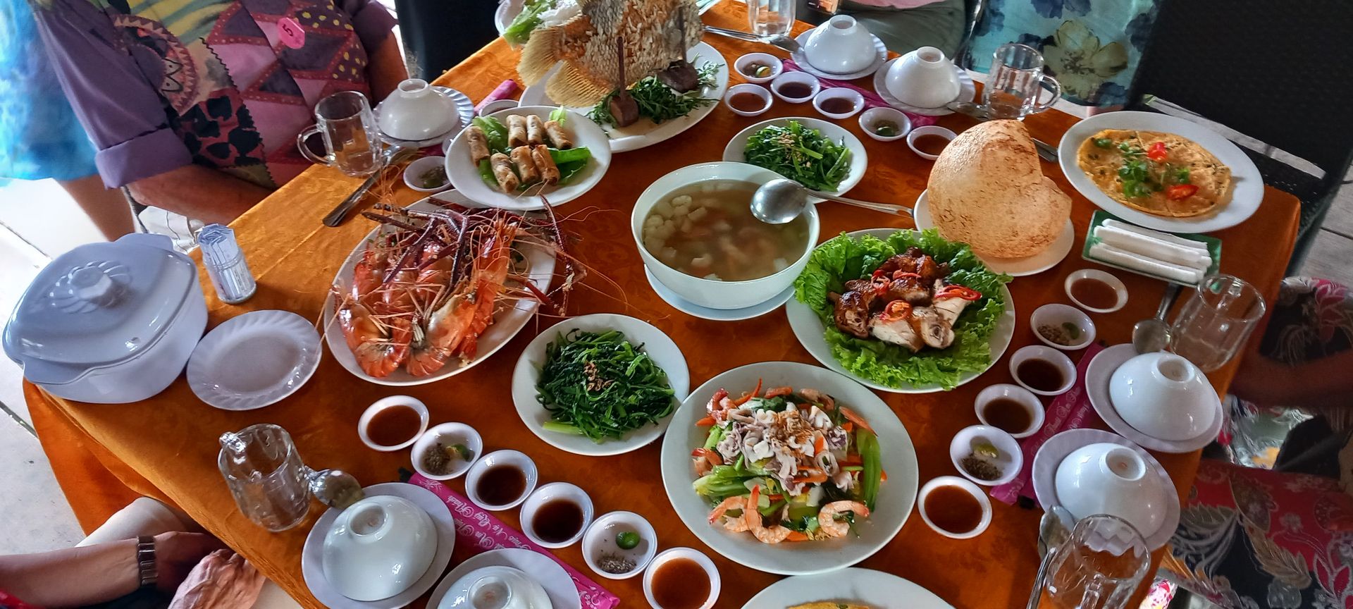 Mit etwas Verspätung, da wir mit dem Boot wieder 20 Minuten bis zum Restaurant auf einer Insel, sehr schön angelegt. Hier wurde groß aufgetischt, es war wirklich reichhaltig. Leider war vieles, inklusive der Suppe, schon kalt. Einigen Gästen machte das nichts aus und waren begeistert, aber wenn man weiß wie vietnamesische Essen schmecken könnte, reißt es einem nicht von den Socken.