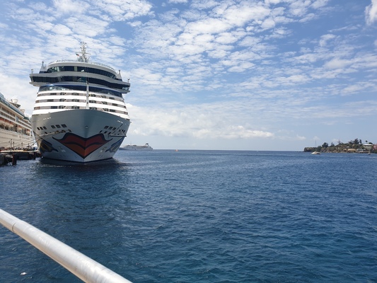Schon im Hafen wird sichtbar, es wurde was zum Schutz der Stadt getan. Riesige Felsbrocken dienen als Wellenbrecher. Unsere Luna liegt neben der „Grandeur of the Seas“, ein Kreuzfahrtschiff der Royal Caribbean. Mir gefällt die Luna besser, allein schon wegen des Kussmundes.