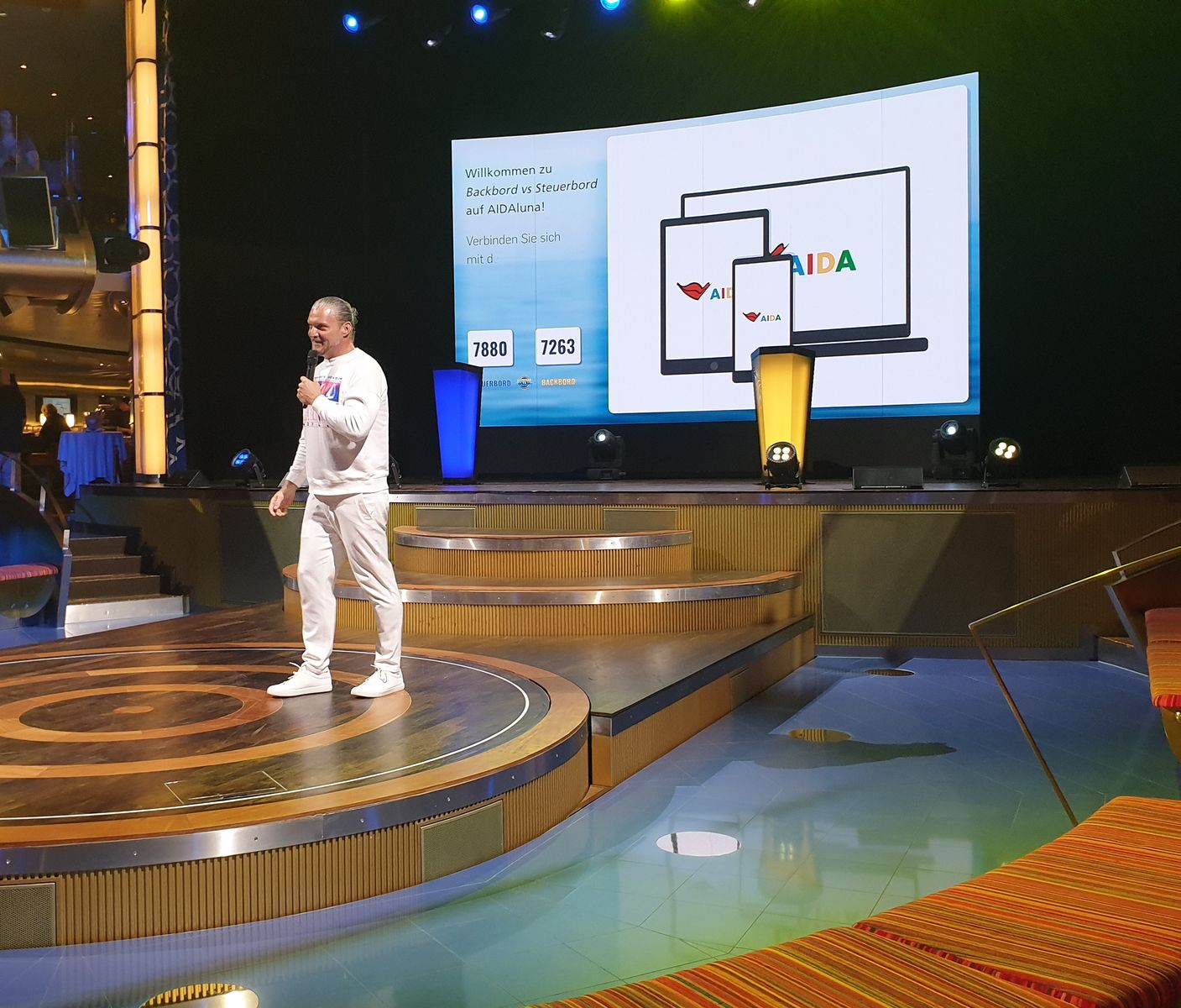 Die Bühne hat keine Zeit, heute abzukühlen. Entertainment Manager Olli ist ganz gespannt, wie die Gameshow: Backbord oder Steuerbord ausgehen wird.