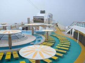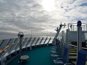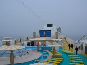 Ein Lichtblick. Lichtblick? Richtig! Zeit für das Frühstück. Wieder mit Kreuzfahrergerds. Anschließend trafen und zerstreuten wir uns – der Neunerclan – „in alle Winde“. Sofern es überhaupt möglich war. Kreuzfahrergerda und meine bessere Hälfte nahmen an einem Silberschmuck-Workshop teil. Ich setzte mich auf Deck 14 in die Sonne. Sonne? Sie kam nur kurze Zeit durch die Wolken. Aber sie kämpfte weiter. Doch noch immer vergebens. Seenebel. Luft 4°. Wasser 7 °. Und ich saß dort und schrieb diese Zeilen …