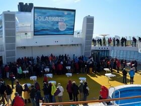 Kein Neptun wie vor zwei Jahren, dafür die gewohnten Prüfungen. Anschließend die vom Kapitän persönlich unterschriebenen Urkunden. Und danach ein Foto mit Kapitän May – das Ausharren in der Kälte hatte sich doch noch gelohnt! Übrigens, mein Kompliment an unseren Kapitän, der drei Stunden lächelnd im Freien stand und trotzdem nicht auf Deck festfror!