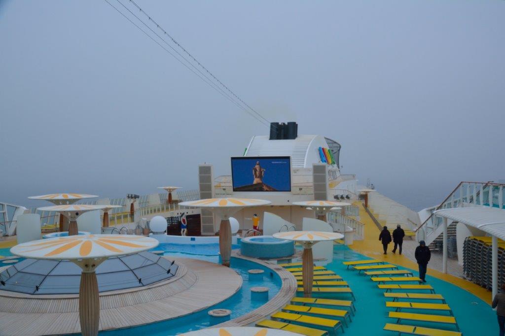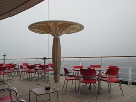 Wir frühstückten wieder mit Kreuzfahrergerds. Auch Frühaufsteher. Oder so ähnlich … Danach inhalierten wir die frische Seeluft – im Seenebel.