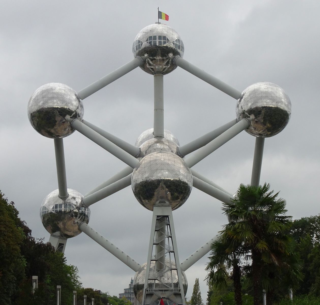 Das 102 Meter hohe Atomium, eines der berühmtesten Gebäude Belgiens, meistbesuchte Touristenattraktion und damit fast schon ein Synonym für die Stadt Brüssel, wurde anlässlich der „Expo 58“ in Brüssels Vorort Heysel errichtet. Aus neun glänzenden Kugeln, weil mittlerweile Edelstahl, besteht das Bauwerk und stellt ein milliardenfach vergrößertes Modell des von neun Atomen gebildeten Eisenmoleküls dar. Sollte damals wie heute die friedliche Nutzung des Atomzeitalters symbolisieren.