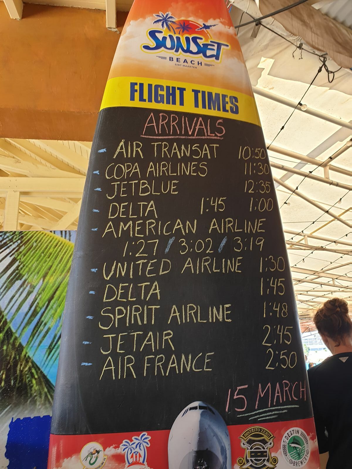 Und eh wir uns versehen sind wir am Maho Beach angekommen, an den fast jeder Tourist einmal gewesen sein muss. Direkt am Küstenstreifen liegt der Princess Juliana International Airport. Vor vielen Jahren wurde er renoviert und erhielt ein neues Terminal. Die Flugzeuge, die dort landen kommen vom Meer her, überfliegen in geringer Höhe den Strand und es gibt eine schmale Straße vor dem Zaun, bevor sie auf der Landebahn aufsetzen. Der Strandabschnitt wurde für den Tourismus freigegeben, aber überall stehen Warnhinweise, was man beim Landeanflug beachten sollte. Damit man nichts verpasst, steht dort ein Surfbrett, auf dem die Ankunftszeiten der Maschinen vermerkt sind.